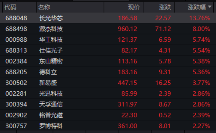 概念板块方面,CPO概念大涨,万得光模块(CPO)概念指数盘中涨幅超过3%,长光华芯盘中涨幅超过15%,源杰科技盘中涨幅超过9%,华工科技、仕佳光子盘中涨幅超过6%,截至午间收盘,涨幅有所收窄。