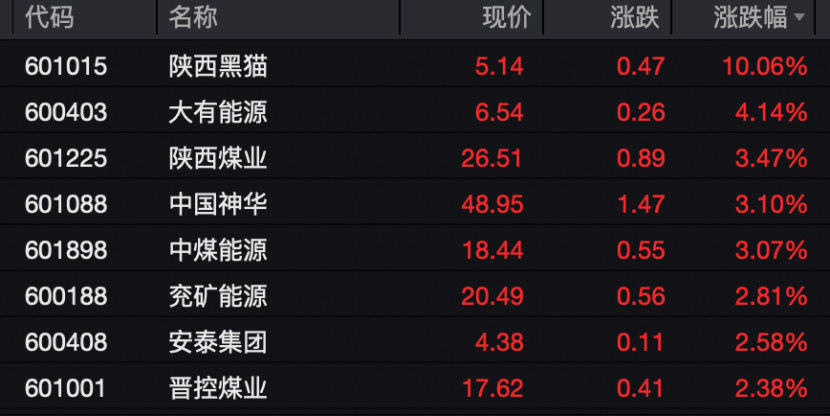 煤炭板块领涨,成为上午市场最抗跌板块之一,陕西黑猫盘中涨停,大有能源、陕西煤业等股票跟涨。此外,通信、公用事业等板块涨幅也居于前列。