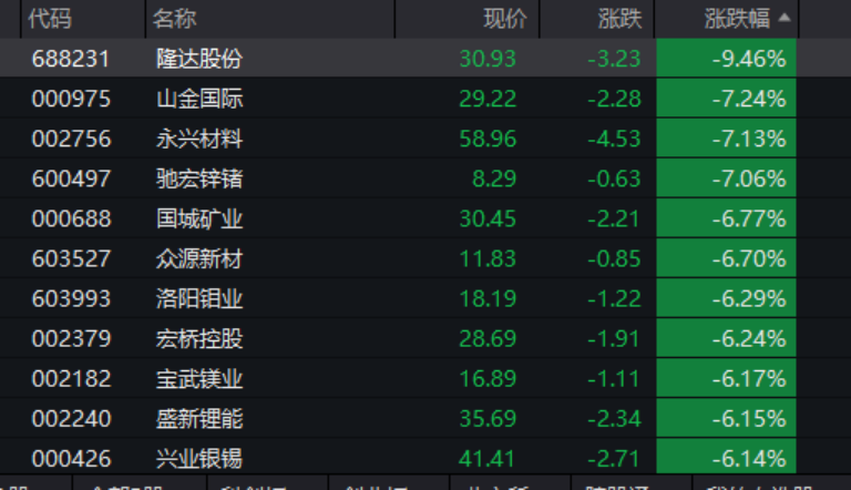 行业板块和赛道方面,若按照申万一级行业划分,有色金属板块重挫,板块跌幅超过4%,隆达股份跌幅超过9%,山金国际、永兴材料、驰宏锌锗、国城矿业等多股盘中跌幅超过7%。