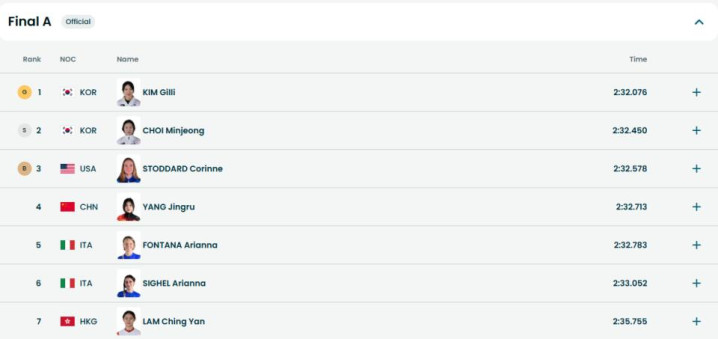 韩国两位选手发挥出色,金桔里2分32秒076获得冠军,首次赢得冬奥会单项冠军;崔玟桢2分32秒450获得亚军,连续三届在该项目上摘取银牌,个人已经拿下冬奥七块奖牌(四金三银)。美国选手斯托达尔德2分32秒578获得季军。